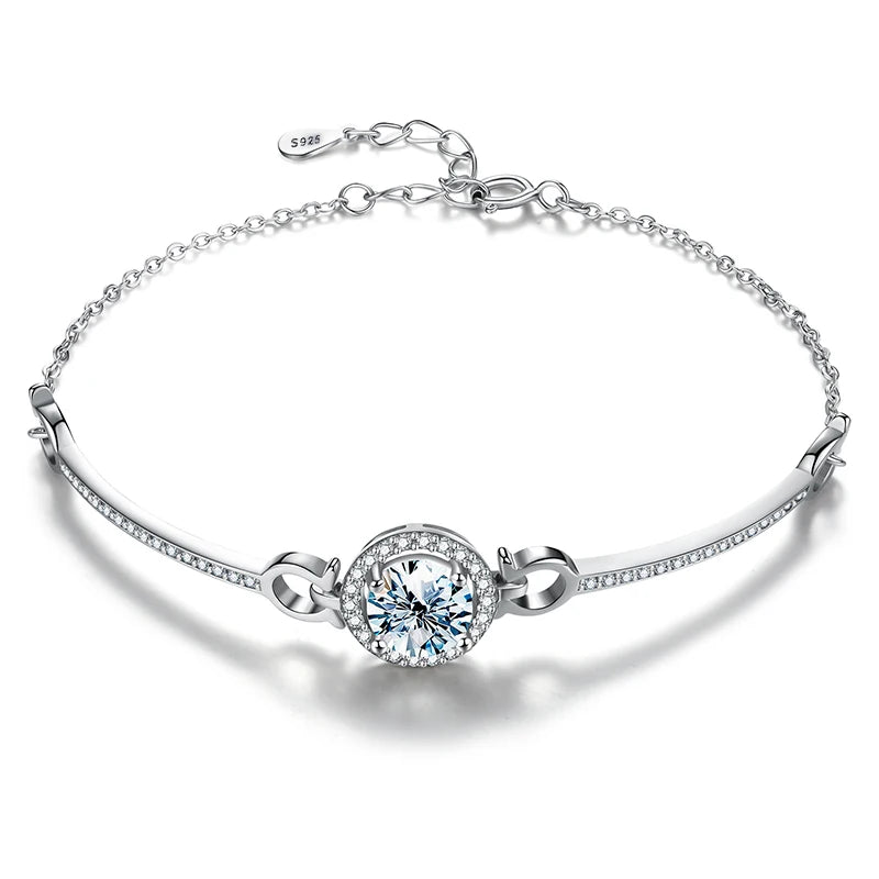Add a touch of modern elegance to your jewelry collection with this trendy charm bracelet, beautifully crafted from genuine 925 sterling silver. Featuring a brilliant round moissanite centerpiece, it delivers a refined sparkle that enhances its sleek and contemporary design. Lightweight at approximately 2.2g, the bracelet offers comfortable wear, while the adjustable length ensures a perfect fit on any wrist.